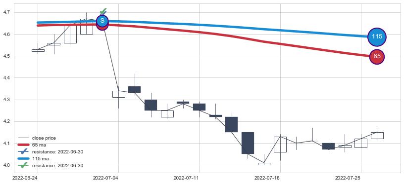 下跌趋势2022-06-24-2022-07-26,均线65, 115确认关键阻力1处