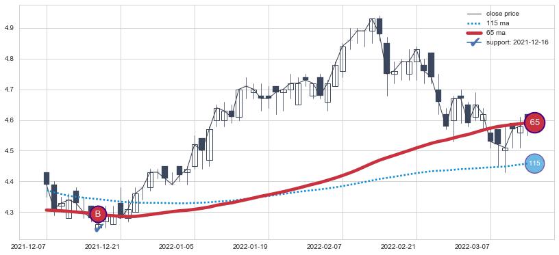 上涨趋势2021-12-07-2022-03-14,均线65确认关键支撑1处