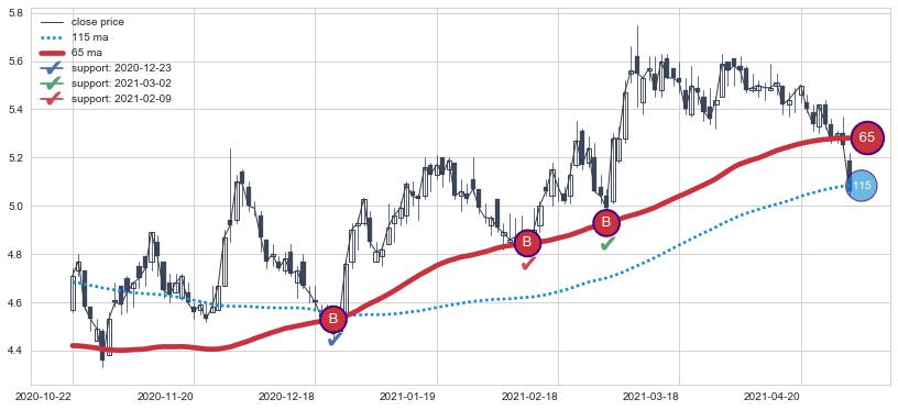 上涨趋势2020-10-22-2021-04-30,均线65确认关键支撑3处