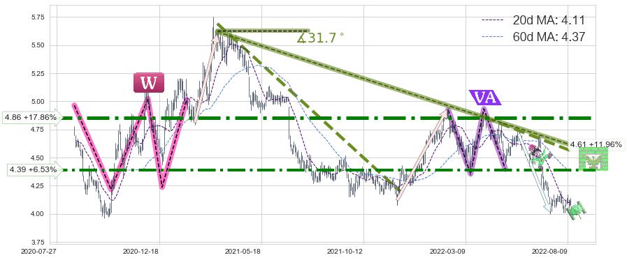 ♘ 阻力价格位4.39,可信任强度76.53%,距离最后交易2022-08-12形成的收盘价格4.12相差 +6.53%