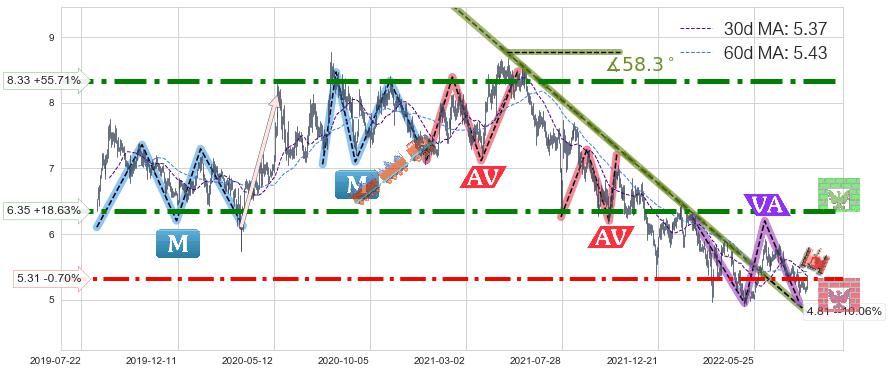 ➣ 【仅预测突破】最后价格:5.35与预测突破价格:5.98→【空间较大】后续最小【反转】第一目标价格→(2022-10-19: 6.97 )