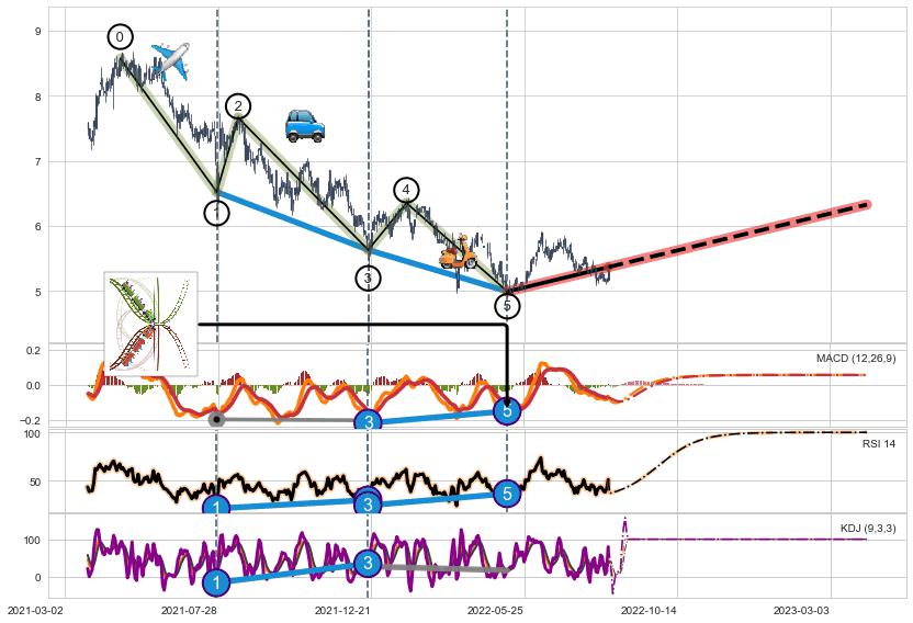 ➢ 1,3,5驱动浪MACD, RSI, KDJ走势都出现【常规背离】反转信号增强