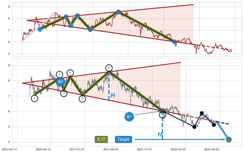 ➢ 最小反转跌幅→𝐇: 1.8533 (逐步抬高阻力斜边最后的阻力点⑥与支撑边垂直距离)