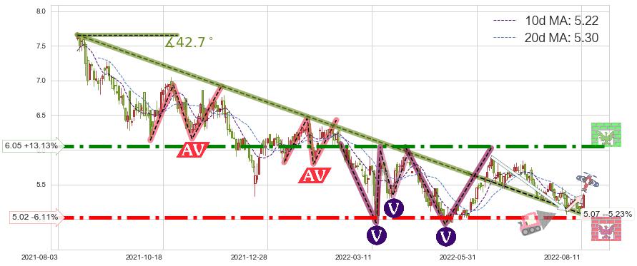 ⚔️ 2021-08-16-2022-05-25下跌趋势存在反转上涨[机会],其原下跌趋势的阻力位(5.07)已被突破[强支撑信号],原下跌趋势角度: 42.7˚