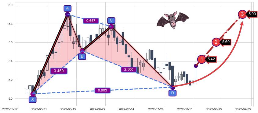 ➣ 已完成【蝙蝠】形态起点X: 2022-05-24, 终点D: 2022-08-02, 共49交易日