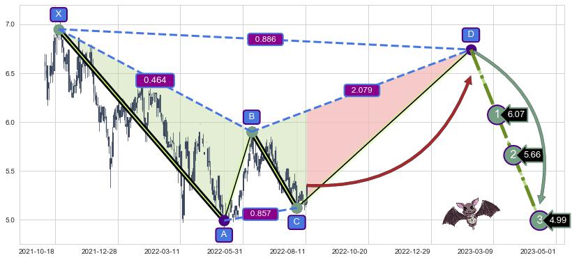 ➣ 未完成【蝙蝠】形态起点X: 2021-10-21, 已到达C点: 2022-08-02, 预测最终D点: 2023-02-13, 共330交易日