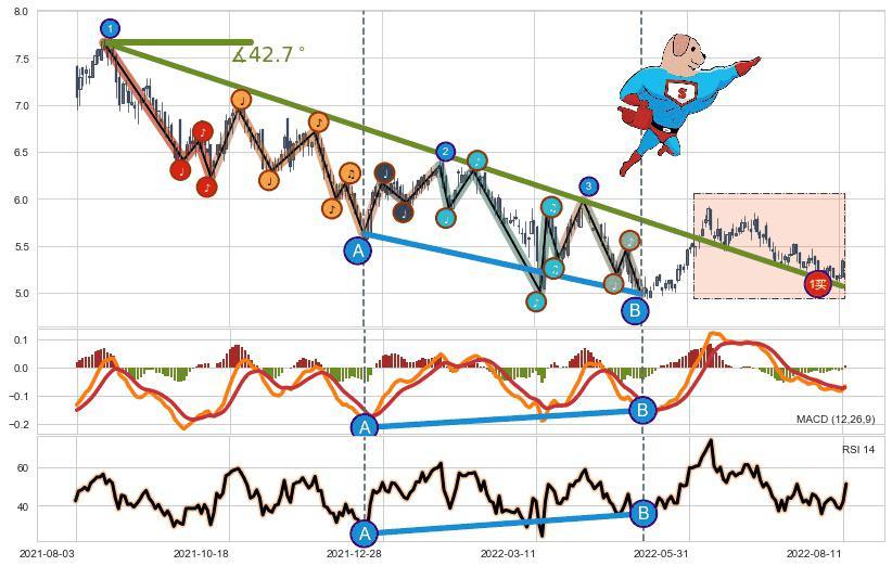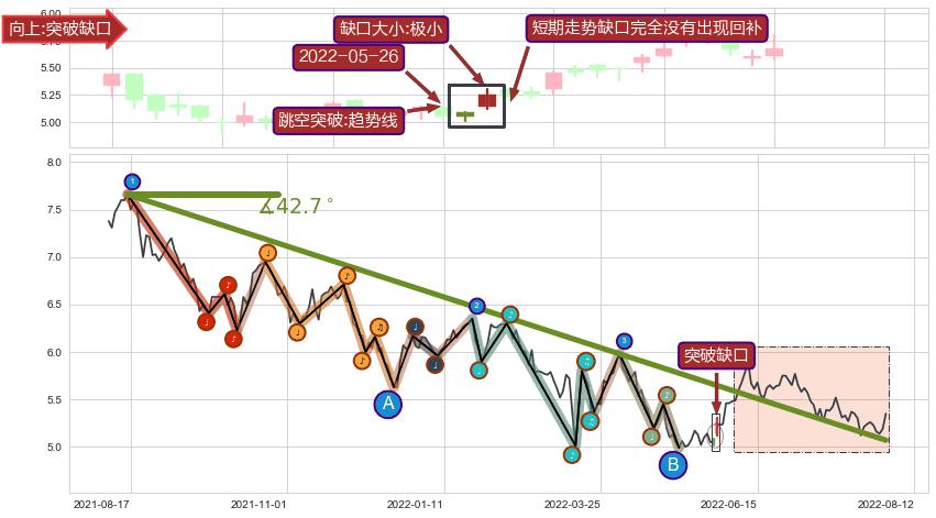 ➣ 2021-08-16-2022-05-25下跌趋势存在反转上涨[机会],其原下跌趋势的阻力位(5.07)已被突破[强支撑信号],原下跌趋势角度: 42.7˚