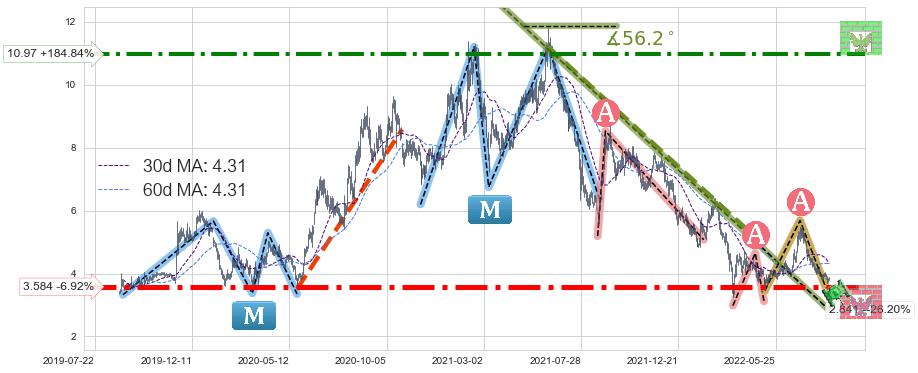 ♘ 支撑价格位3.584,可信任强度88.09%,距离最后交易2022-08-12形成的收盘价格3.850相差 -6.92%