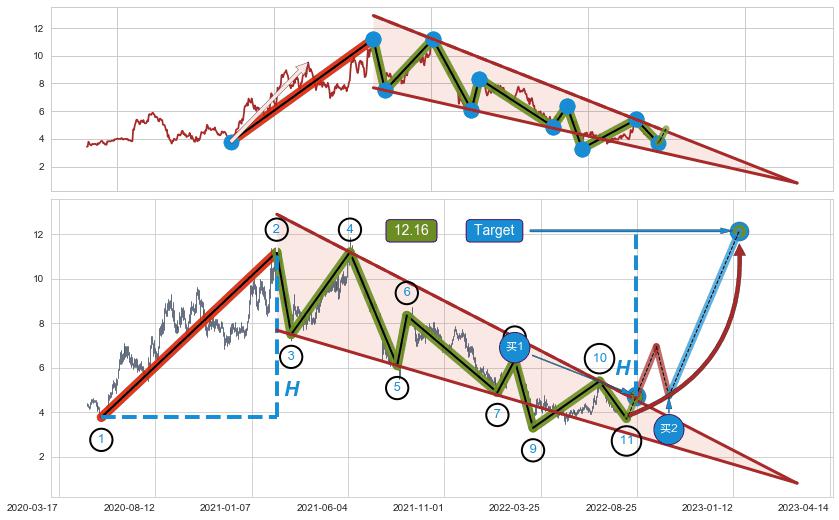 ➢ 最小中继整理涨幅→𝐇: 7.43 (𝐇楔型旗杆的长度:楔型起点→顶点)