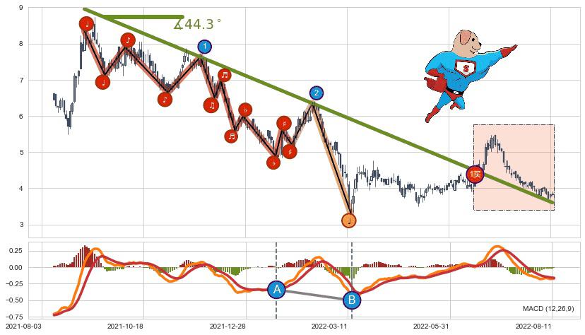 ➣ 2021-09-01-2022-04-12下跌趋势存在反转上涨[机会],虽然原下跌趋势的阻力位(3.604)已被突破,但其阻力效果尚存,原下跌趋势角度: 44.3˚
