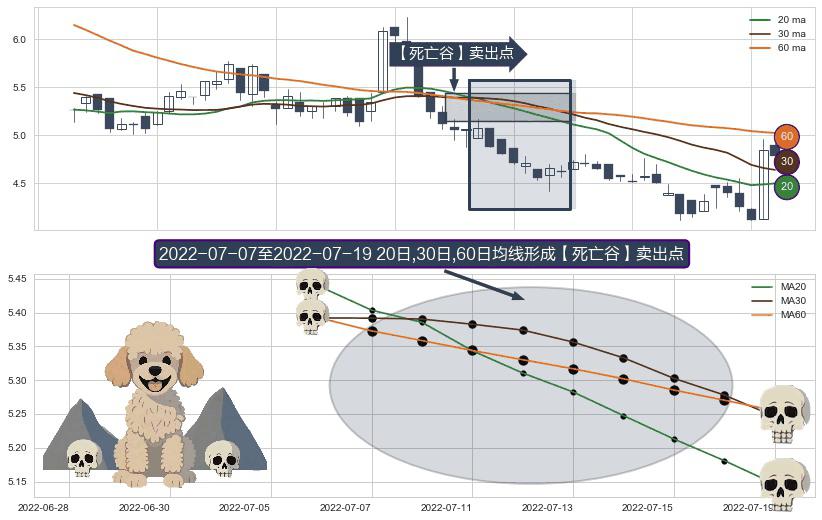 形态多维评估: ⚀ 2022-07-08-日至2022-07-19-日显现 20日-30日-60日均线 【死亡谷】卖出点 看空信号,后市看跌,卖出