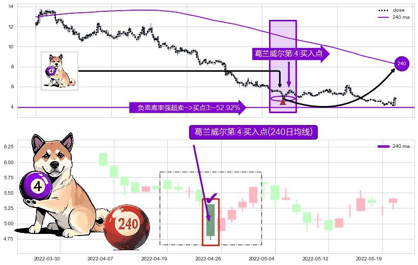 形态多维评估: ⚀ 2022-04-25-日显现 葛兰威尔均线 240日均线 第④买入点 下降趋势均值回复的短线反弹信号,后市看涨,买进信号