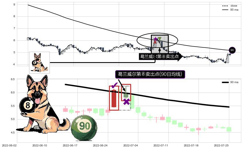 形态多维评估: ⚀ 2022-06-29-日显现 葛兰威尔均线 90日均线 第⑧卖出点 下降趋势的中继信号,后市看跌,卖出信号