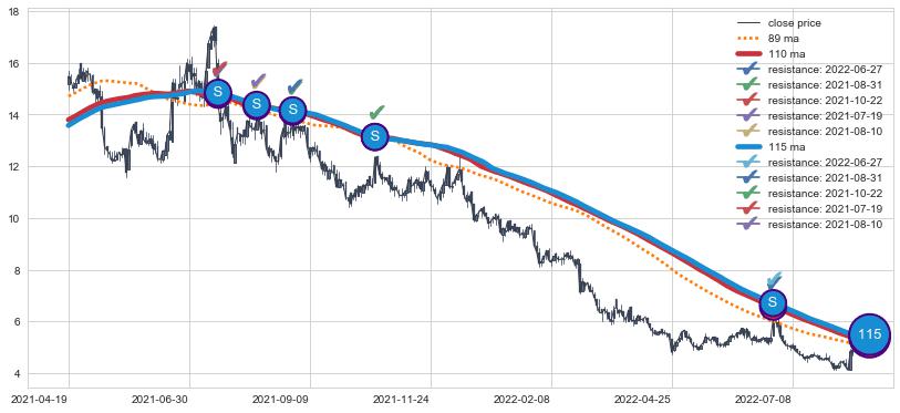 下跌趋势2021-04-19-2022-08-12,均线115, 110确认关键阻力5处