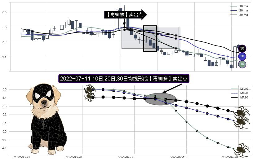 形态多维评估: ⚀ 2022-07-11日显现 10日-20日-30日均线 【毒蜘蛛】卖出点 看空信号,后市看跌,卖出