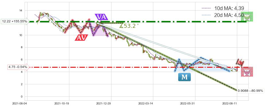 ♘ 阻力价格位12.22,可信任强度96.63%,距离最后交易2022-08-12形成的收盘价格4.78相差 +155.55%