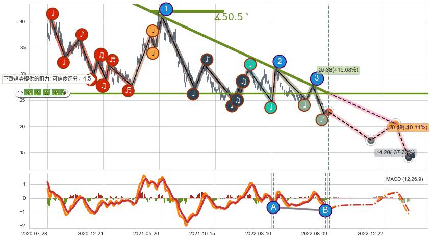 ♘ 在最后的下跌阶段2020-08-05至2022-08-12,存在 持续未破位的阻力位 ,阻力价格26.38,可信任强度88.38%,其距离最后价格22.80相差 +15.68%