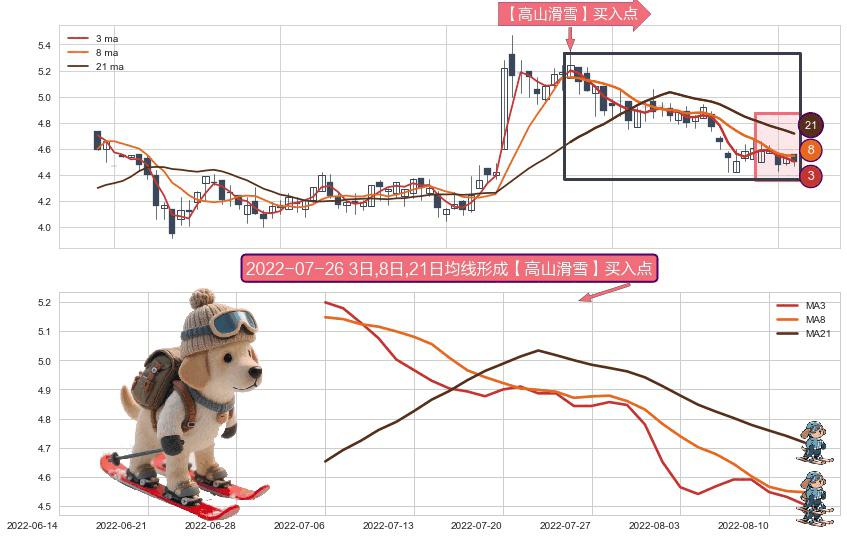 形态多维评估: ⚀ 2022-07-06日-2022-08-12日显现 3日-8日-21日均线 【高山滑雪】买入点 看多信号,后市看涨,买入