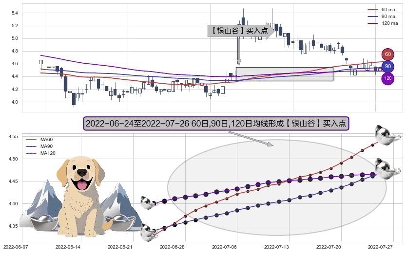 形态多维评估: ⚀ 2022-06-27-日至2022-07-26-日显现 60日-90日-120日均线 【银山谷】买入点 看多信号,后市看涨,买入