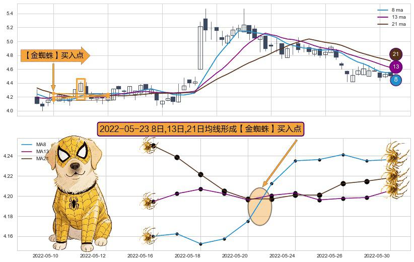 形态多维评估: ⚀ 2022-05-23日显现 8日-13日-21日均线 【金蜘蛛】买入点 看多信号,后市看涨,买入