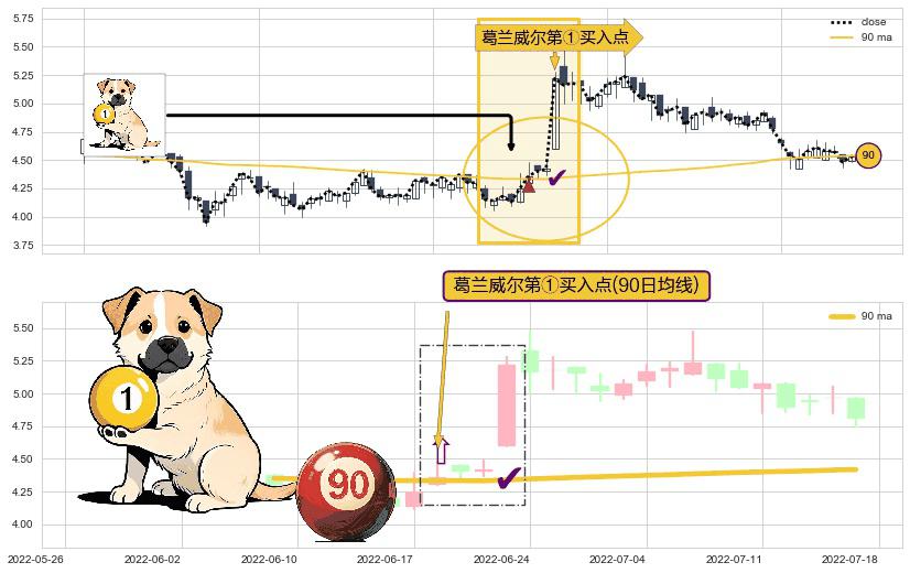 形态多维评估: ⚀ 2022-06-20-日显现 葛兰威尔均线 90日均线 第买①入点 走势反转见底信号,后市看涨,买进信号