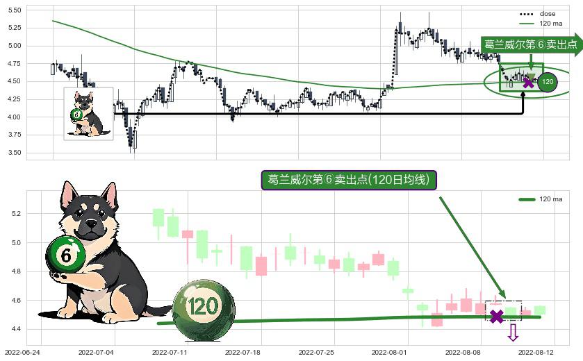 形态多维评估: ⚀ 2022-08-10-日显现 葛兰威尔均线 120日均线 第⑥卖出点 走势反转见顶信号,后市看跌,卖出信号