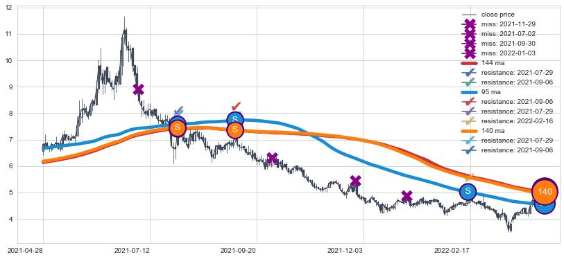 下跌趋势2021-04-28-2022-03-31,均线144, 140, 95确认关键阻力3处