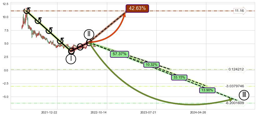➣ 调整浪已超过预测的c点位置,后续大趋势循环浪继续下跌概率57.37%,谨慎做多