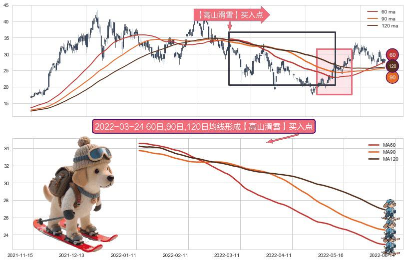 ⚀ 2022-01-12日-2022-06-08日显现 60日-90日-120日均线 【高山滑雪】买入点 看多信号,后市看涨,买入