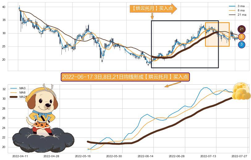 ⚀ 2022-05-13日-2022-07-22日显现 3日-8日-21日均线 【烘云托月】买入点 看多信号,后市看涨,买入