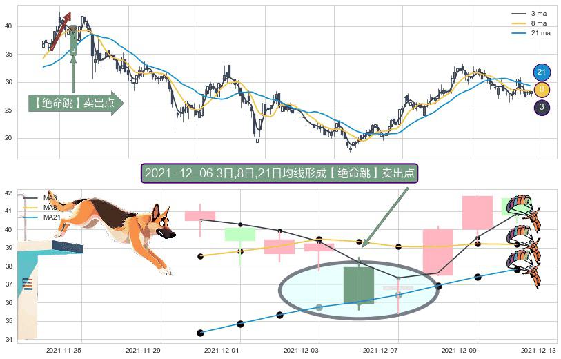 ⚀ 2021-12-06日显现 3日-8日-21日均线 【绝命跳】卖出点 看空信号,后市看跌,卖出