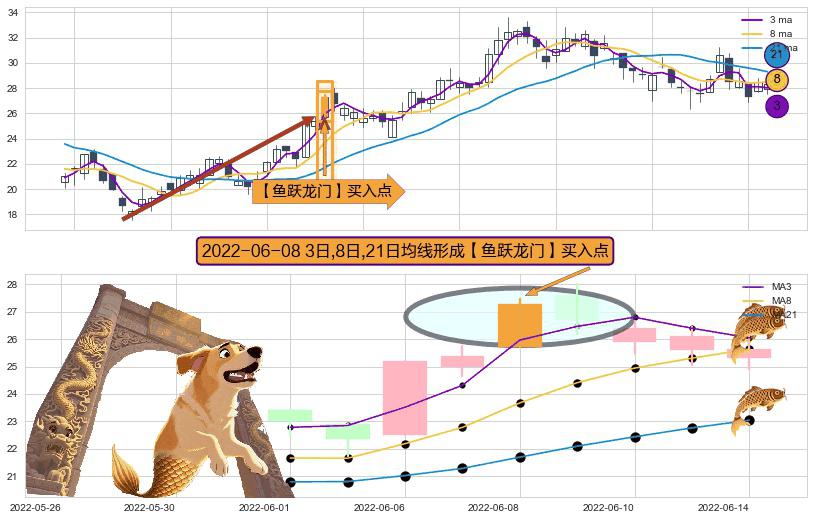 ⚀ 2022-06-08日显现 3日-8日-21日均线 【鱼跃龙门】买入点 看多信号,后市看涨,买入