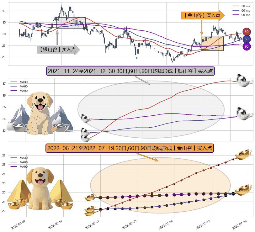 ⚀ 2022-06-22-日至2022-07-19-日显现 30日-60日-90日均线 【金山谷】买入点 其再次确认了买入信号,可靠性更强,买入
