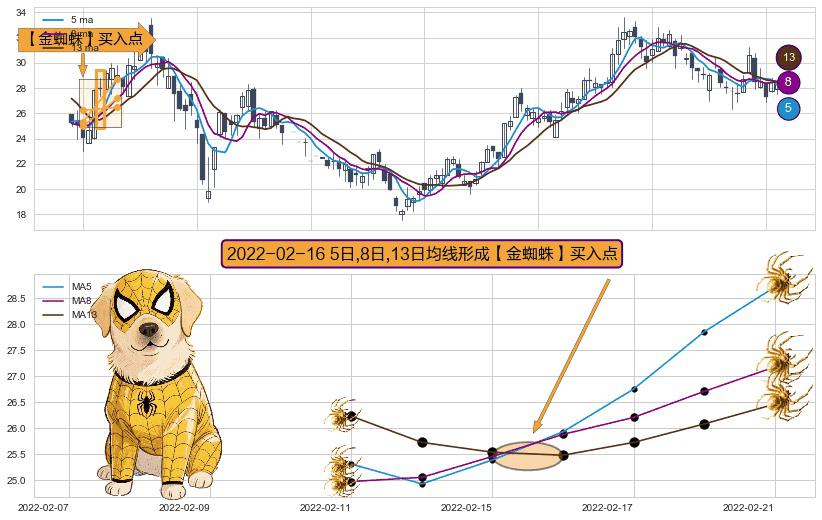⚀ 2022-02-16日显现 5日-8日-13日均线 【金蜘蛛】买入点 看多信号,后市看涨,买入