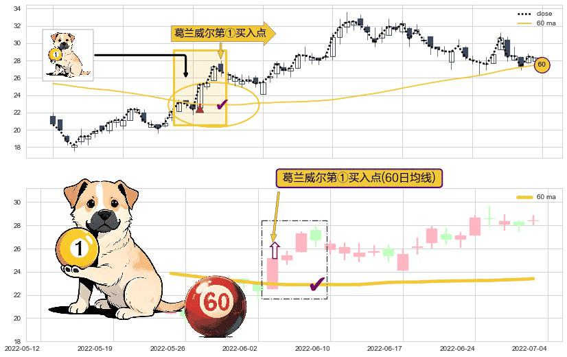 ⚀ 2022-06-06-日显现 葛兰威尔均线 60日均线 第买①入点 走势反转见底信号,后市看涨,买进信号