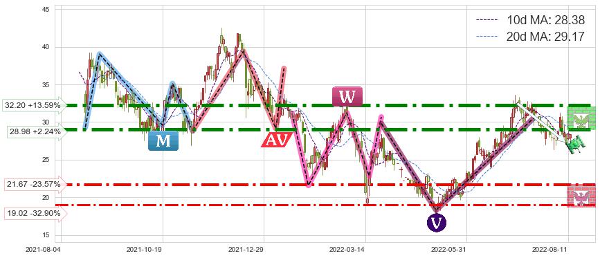 ♘ 阻力价格位32.20,可信任强度90.30%,距离最后交易2022-08-12形成的收盘价格28.35相差 +13.59%