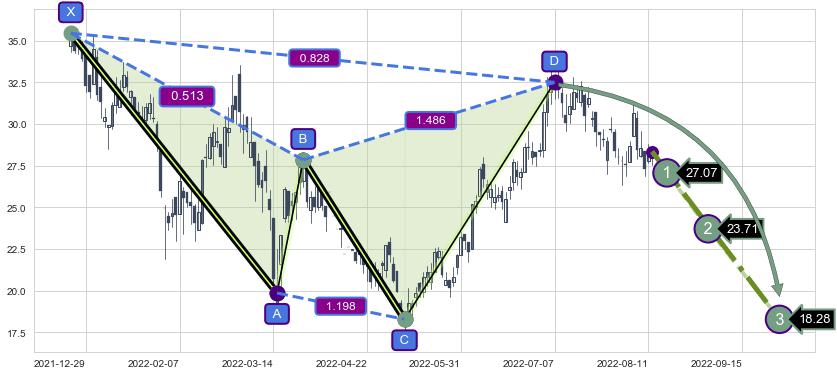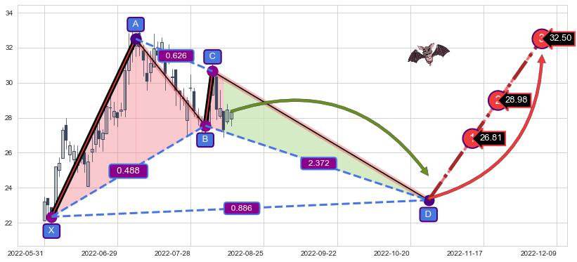 ➣ 未完成【蝙蝠】形态起点X: 2022-06-02, 已到达C点: 2022-08-05, 预测最终D点: 2022-10-27, 共102交易日