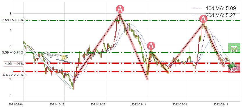 ♘ 阻力价格位5.59,可信任强度82.54%,距离最后交易2022-08-12形成的收盘价格5.05相差 +10.74%