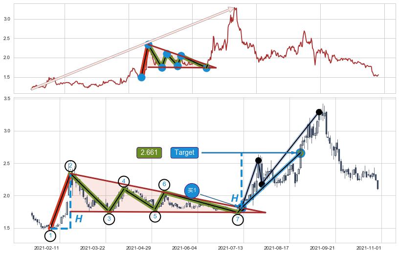 ➢ 最小中继整理涨幅→𝐇: 0.8500 (𝐇楔型旗杆的长度:楔型起点→顶点)