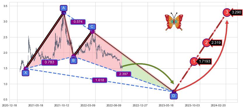 ➣ 未完成【蝴蝶】形态起点X: 2021-02-04, 已到达C点: 2022-02-18, 预测最终D点: 2023-05-16, 共567交易日