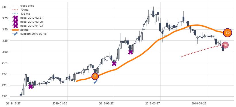 ⚅ 卖点向下突破均线后,价格持续向下走低,向下动能充足,均线斥力助跌效果明显