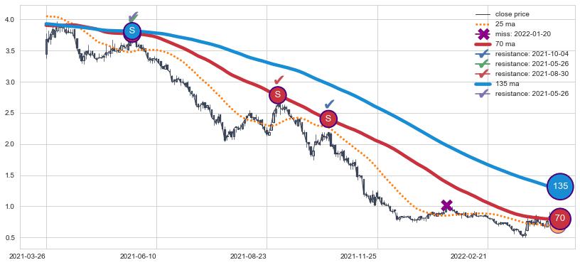 ⚄ 价格在均线遇到阻力后已再次向下回落了【极长】距离, 第⑦卖出点 阻力效果得到【明确确认】