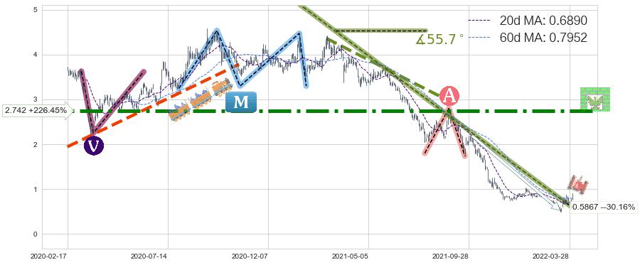 ♘ 在最后的下跌阶段2020-09-18至2022-03-22,存在 破位边缘的阻力位 ,阻力价格0.5867,可信任强度83.53%,其距离最后价格0.8400相差 -30.16%