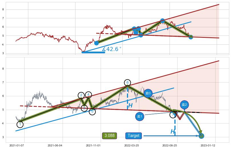 ➢ 最小反转跌幅→𝐇: 1.7459 (逐步抬高阻力斜边最后的阻力点⑥与支撑边垂直距离)