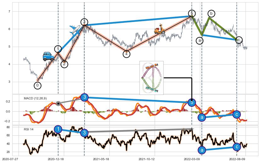 ➣ a, c调整浪端点:【RSI】走势出现【常规背离 & 反转信号】背离程度36.31%,背离夹角角度16.0˚,背离程度中等