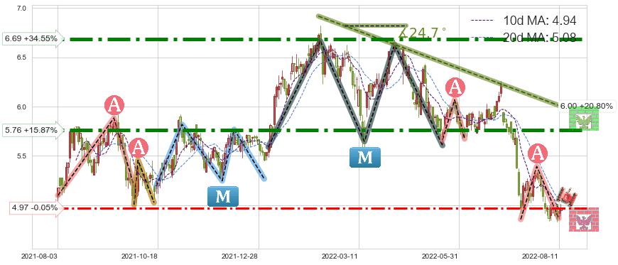 ♘ 阻力价格位5.76,可信任强度88.55%,距离最后交易2022-08-12形成的收盘价格4.97相差 +15.87%