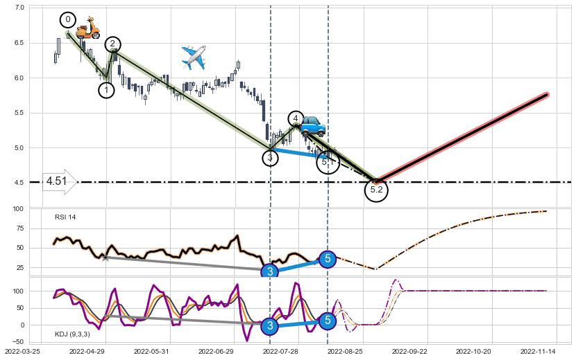 ➣ 5.1: 预测当前第5浪位置(2022-08-10, 4.86),仍然有下跌空间