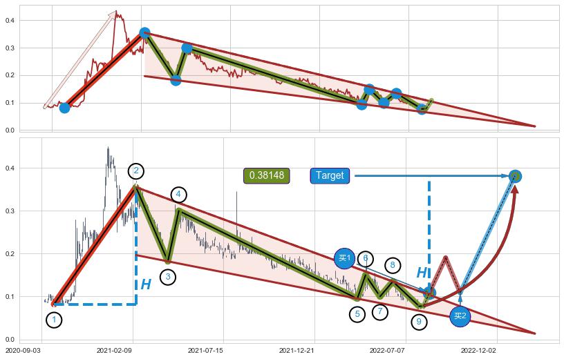 ➣ 最小中继整理跌幅→𝐇: 0.148442 (下侧直角边第一支撑点②与斜边垂直距离)
