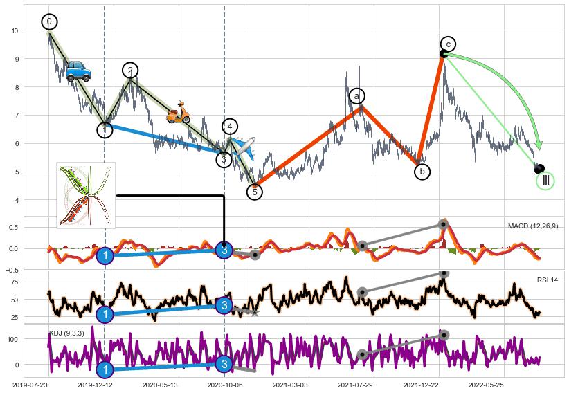 ➣ a,c调整浪MACD, RSI, KDJ走势都【未出现】背离,abc走势延续, 5浪反转概率增强