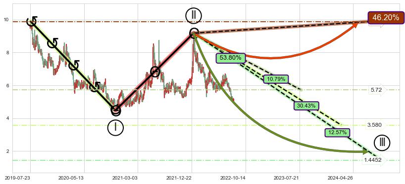 ➣ 调整浪已超过预测的c点位置,后续大趋势循环浪继续下跌概率53.80%,谨慎做多
